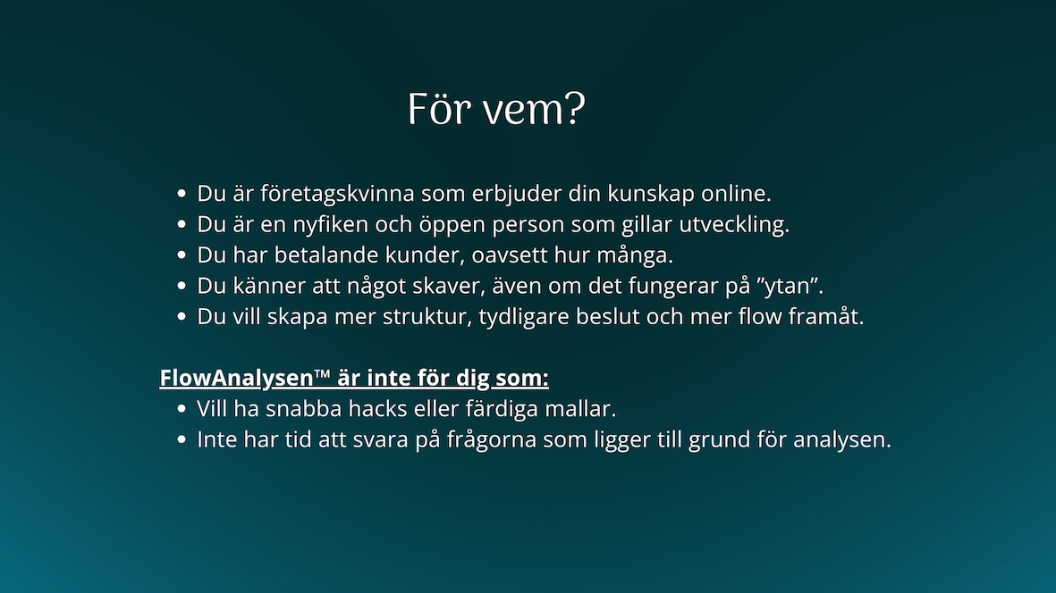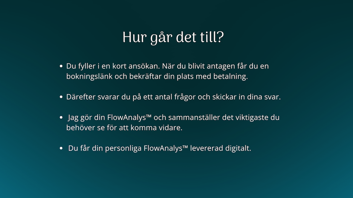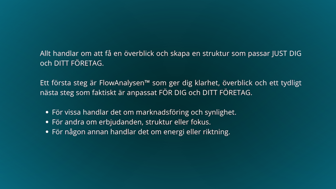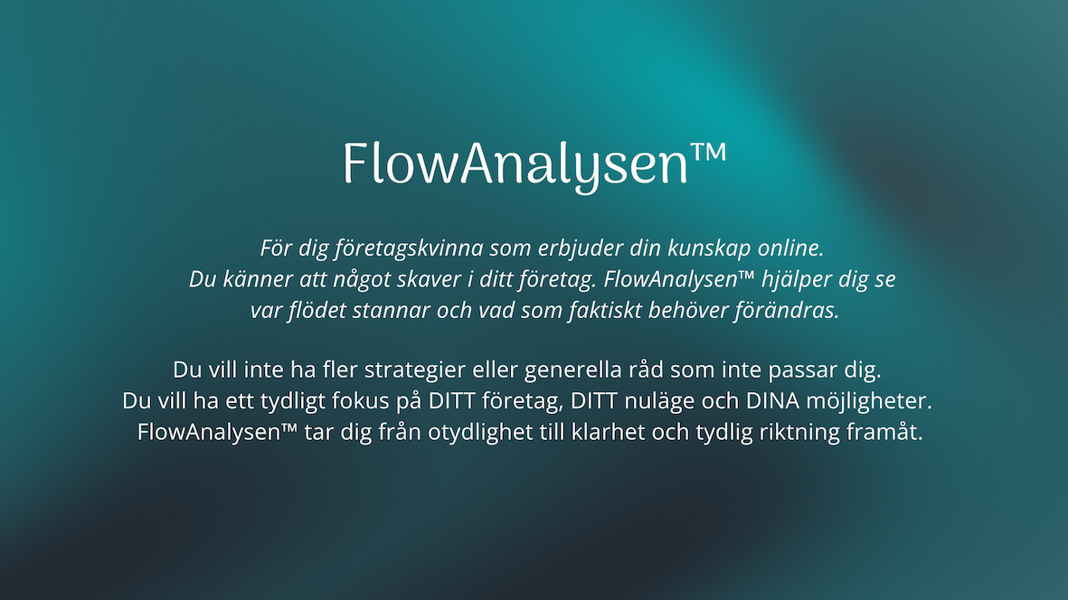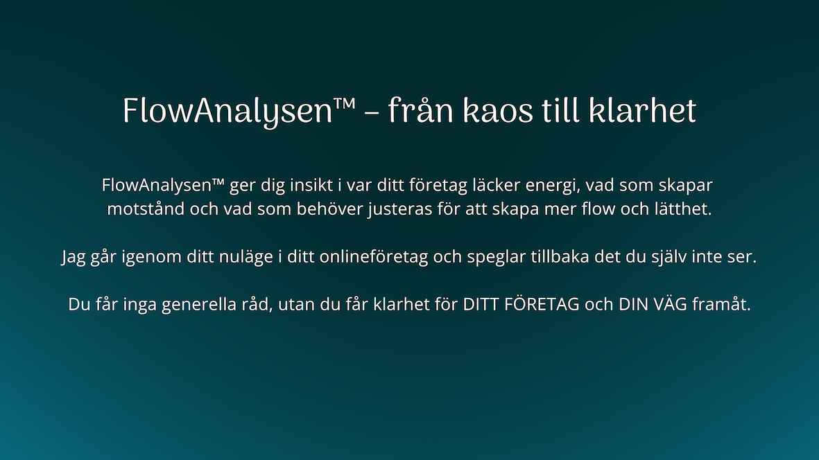 FlowAnalysen™ ger dig en tydlig bild av ditt nuläge och visar var flödet stannar upp och hur du kan komma vidare med mer lätthet. Så om du känner att något inte riktigt fungerar i ditt företag, då är det här en bra plats att börja på.