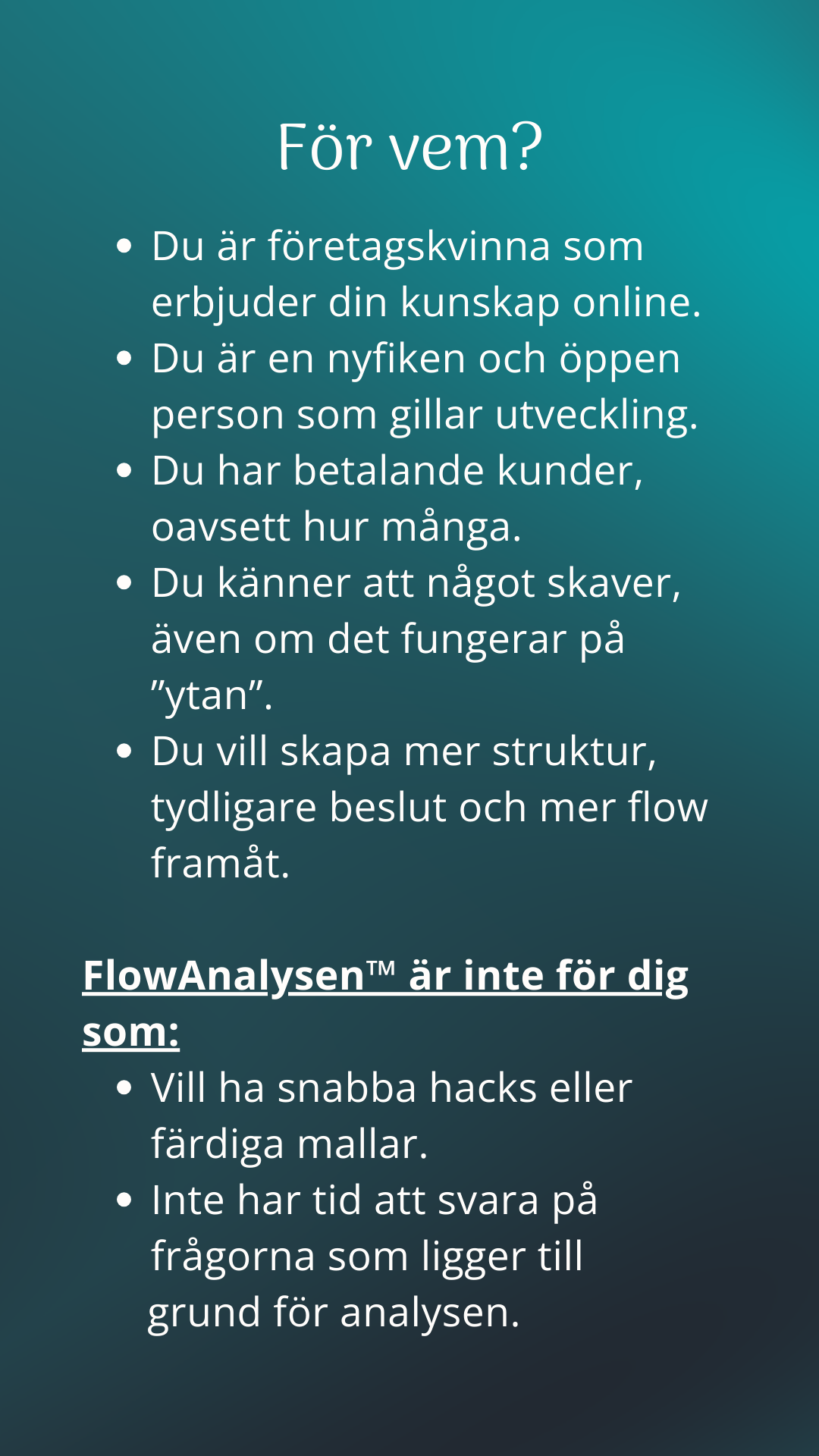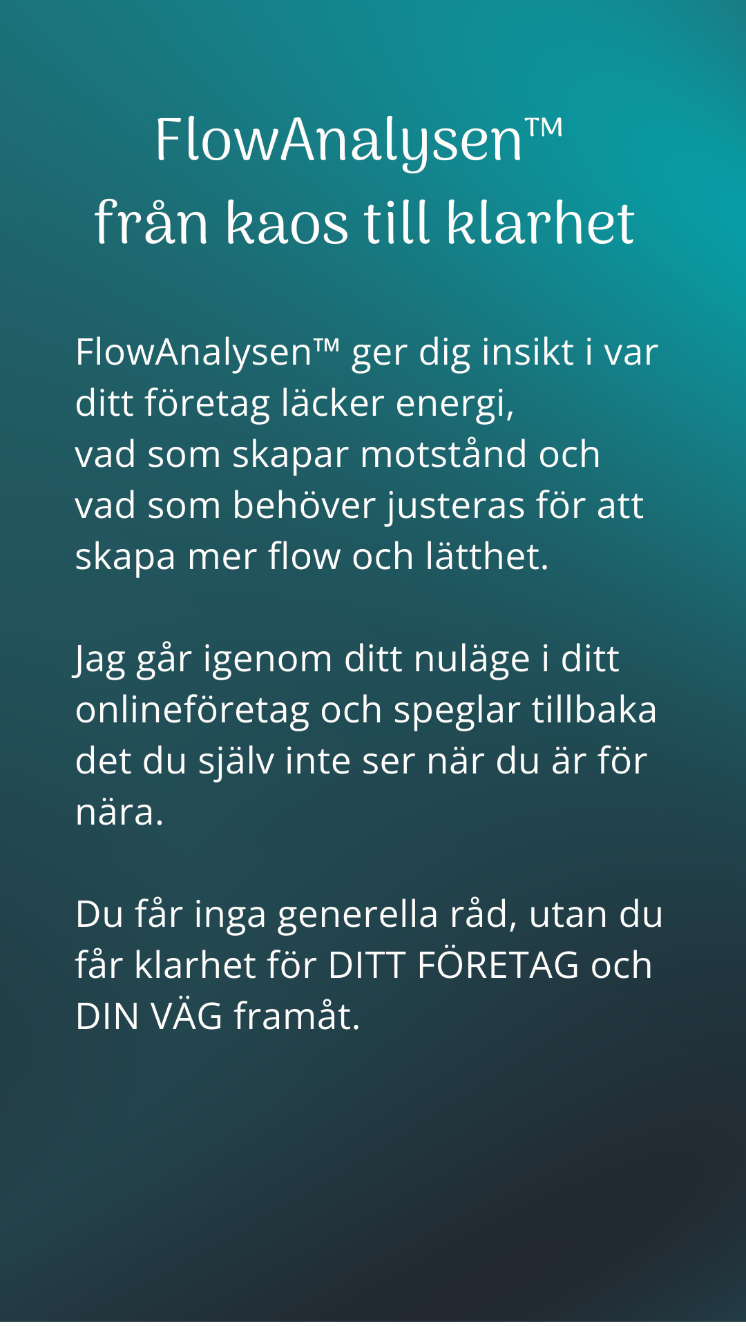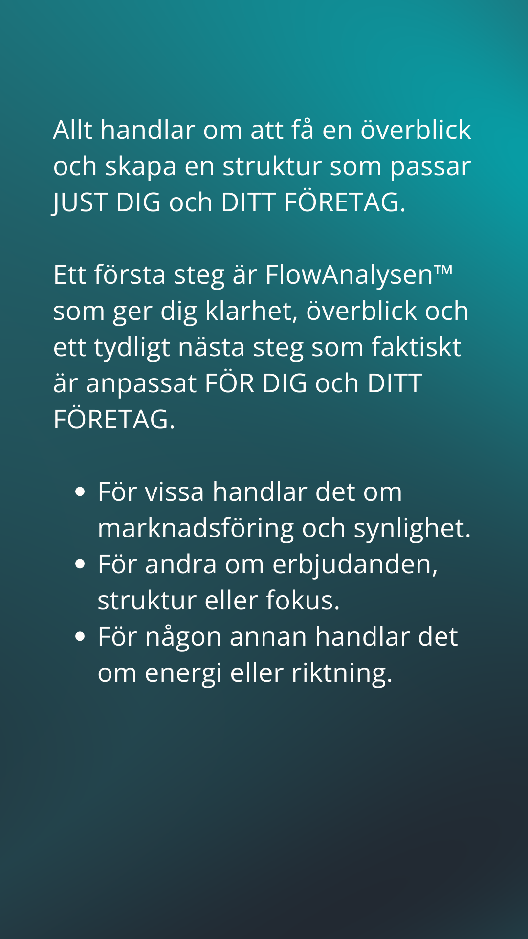 FlowAnalysen™ ger dig en tydlig bild av ditt nuläge och visar var flödet stannar upp och hur du kan komma vidare med mer lätthet. Så om du känner att något inte riktigt fungerar i ditt företag, då är det här en bra plats att börja på.