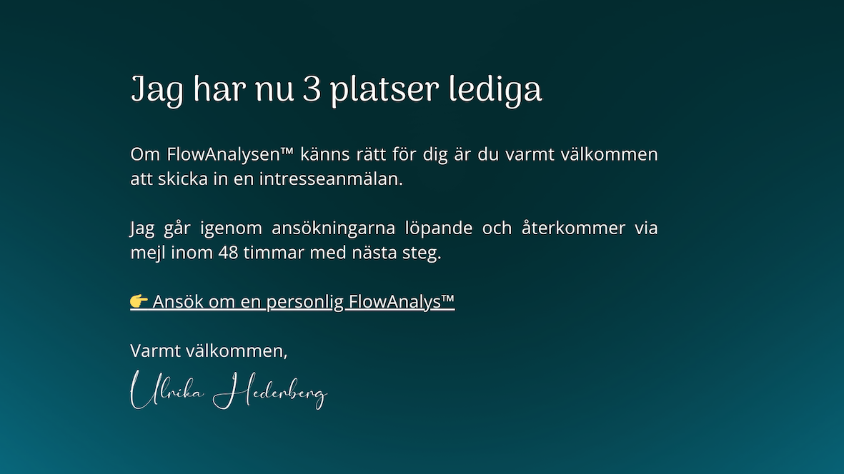 Att få ett tydligt nästa steg framåt för att kunna uppnå mer lätthet, glädje och faktiska resultat i ditt företag. Skriv då upp dig på intresselistan genom att svara på frågorna i länken nedan, så hör jag av mig när jag har en ledig plats.